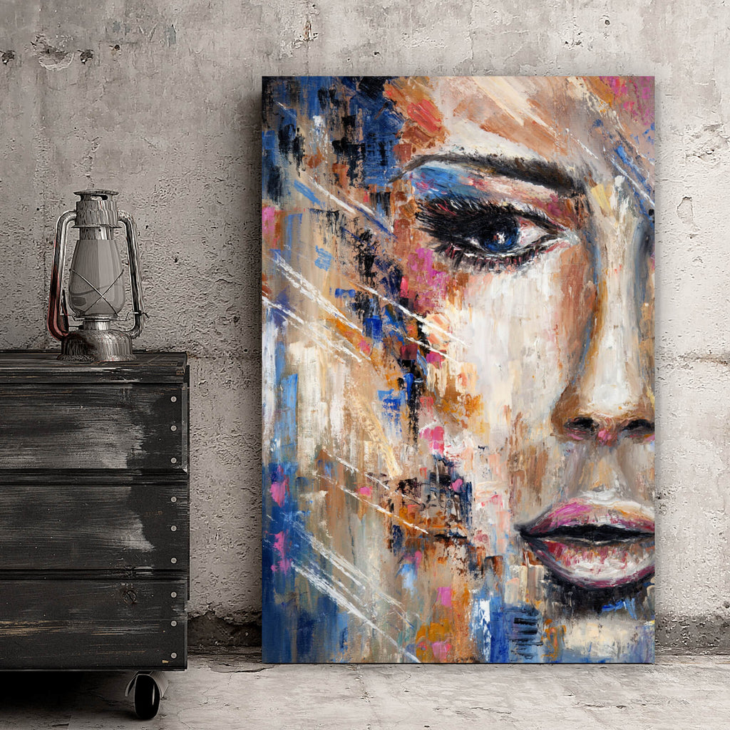 Auf der Suche nach einem ausgefallenen Wandbild als Leinwandbild? Das Motiv Abstraktes Frauengesicht No.1 im Hochformat gefällt dir und du hast nach Wandbildern mit den Wörtern Abstrakt, Frau, Gesicht, Portrait, Kunst und Gemälde gesucht? Dann ist dieses Leinwandbild in der Farbe Bunt genau das richtige Wandbild und Dekorelement für dich! Setze ein Highlight an deiner Wand! Das Leinwandbild Abstraktes Frauengesicht No.1 ist in 4 verschiedenen Größen verfügbar, von klein und dezent bis hin zum XXL Leinwandbild.