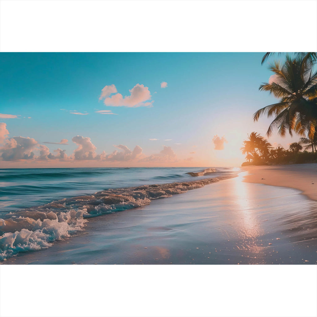 Dieses beeindruckende Wandbild fängt die Essenz eines tropischen Paradieses ein und vermittelt ein Gefühl von Ruhe und Gelassenheit. Im Vordergrund erstreckt sich ein malerischer Strand, dessen sanfte Wellen sanft an das Ufer schlagen. Palmen neigen sich elegant über den Sand, während die untergehende Sonne einen harmonischen Schein über die gesamte Landschaft wirft. Die Komposition des Bildes schafft eine einladende Atmosphäre, die den Betrachter dazu einlädt, sich in die Szene hineinzuversetzen und den Alltagsstress hinter sich zu lassen. Der Horizont erstreckt sich endlos, was die unendlichen Möglichkeiten und die Weite der Natur symbolisiert. Die Anmutung dieses Bildes ist sowohl beruhigend als auch inspirierend, perfekt für Räume, die eine entspannende und zugleich anregende Stimmung erzeugen sollen. Es eignet sich ideal für Wohnzimmer, Schlafzimmer oder Büros, wo es als tägliche Erinnerung an die Schönheit der Natur und das Gefühl von Freiheit und Abenteuer dient. Dank seiner universellen Anziehungskraft und der zeitlosen Ästhetik wird dieses Bild in jedem Raum zu einem Blickfang.