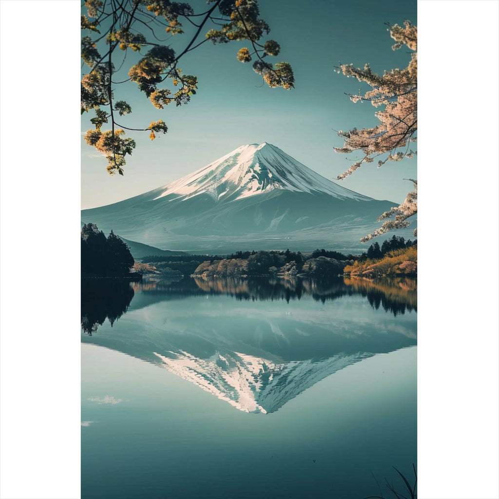 Dieses beeindruckende Wandbild zeigt eine majestätische Berglandschaft mit einem ruhigen See, der die Schönheit der Natur eindrucksvoll einfängt. Der imposante Berg erhebt sich majestätisch im Hintergrund und spiegelt sich perfekt im klaren Wasser des Sees wider, was eine harmonische und beruhigende Atmosphäre schafft. Die Szenerie wird durch filigrane Zweige im Vordergrund ergänzt, die dem Bild Tiefe und Struktur verleihen. Diese Landschaft vermittelt ein Gefühl von Ruhe und Gelassenheit, ideal für Räume, die eine entspannende und meditative Wirkung anstreben. Der klare Himmel und die sanften Formen der Natur erzeugen ein Gefühl der Erhabenheit und zeitlosen Schönheit. Das Bild ist perfekt geeignet für Wohnzimmer, Schlafzimmer oder Büroräume, um eine ruhige und friedliche Umgebung zu schaffen. Es lädt Betrachter dazu ein, in die Weite des Panoramas einzutauchen und die natürliche Harmonie zu spüren. Dieses Kunstwerk ist nicht nur ein visuelles Highlight, sondern auch eine Quelle der Inspiration und des inneren Friedens.