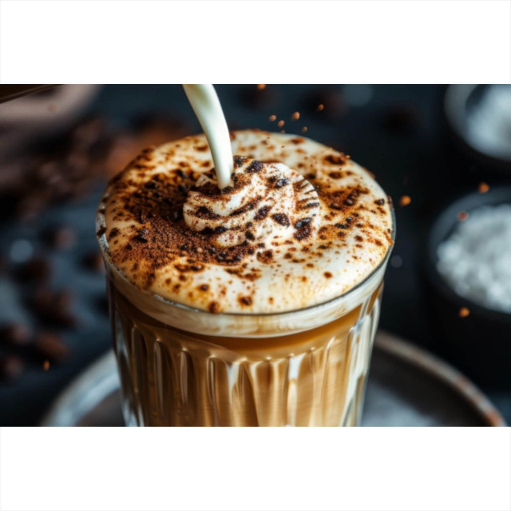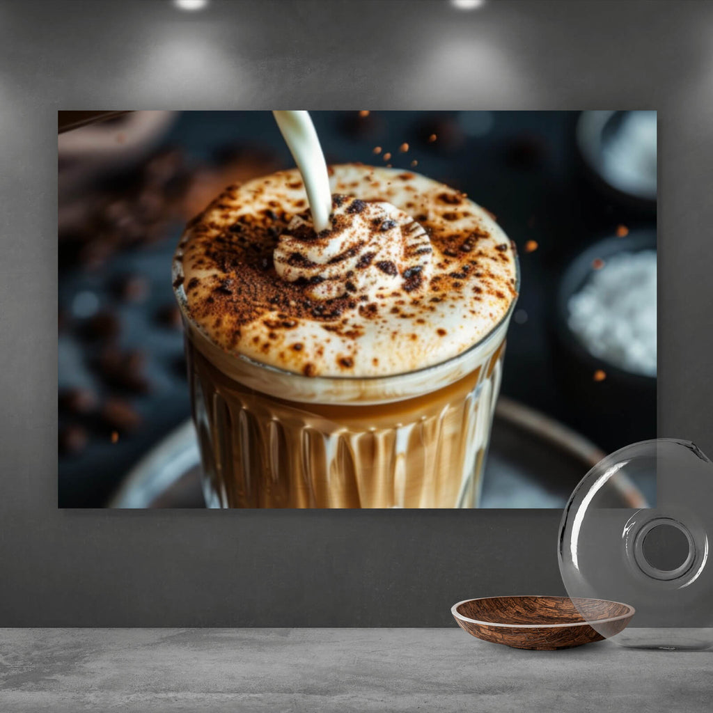 Dieses beeindruckende Wandbild zeigt einen edlen Kaffee mit einer kunstvoll aufgetragenen Sahnehaube, die das Bild zu einem Highlight in jedem Raum macht. Das Motiv strahlt pure Eleganz und Genuss aus und ist perfekt für Liebhaber von Kaffee und kulinarischer Ästhetik. Die sorgfältig platzierten Kaffeebohnen rund um das Glas schaffen eine stimmungsvolle Atmosphäre und laden zum Verweilen ein. Der detailreiche Fokus auf die Sahnehaube mit ihrem filigranen Muster spricht die Sinne an und vermittelt das Gefühl von Wärme und Gemütlichkeit. Die Aufnahme fängt die Essenz des perfekten Kaffeegenusses ein und bietet eine inspirierende Darstellung für Küche, Esszimmer oder auch moderne Cafés. Der künstlerische Stil des Bildes hebt sich durch seine Tiefe und die fesselnde Bildkomposition ab, wodurch es nicht nur visuell ein Genuss ist, sondern auch stilistisch ein Statement setzt. Dieses Wandbild ist eine hervorragende Wahl für alle, die ihre Leidenschaft für Kaffee auf stilvolle Weise zum Ausdruck bringen möchten und gleichzeitig nach einem dekorativen Element suchen, das den Raum mit einem Hauch von Raffinesse bereichert.