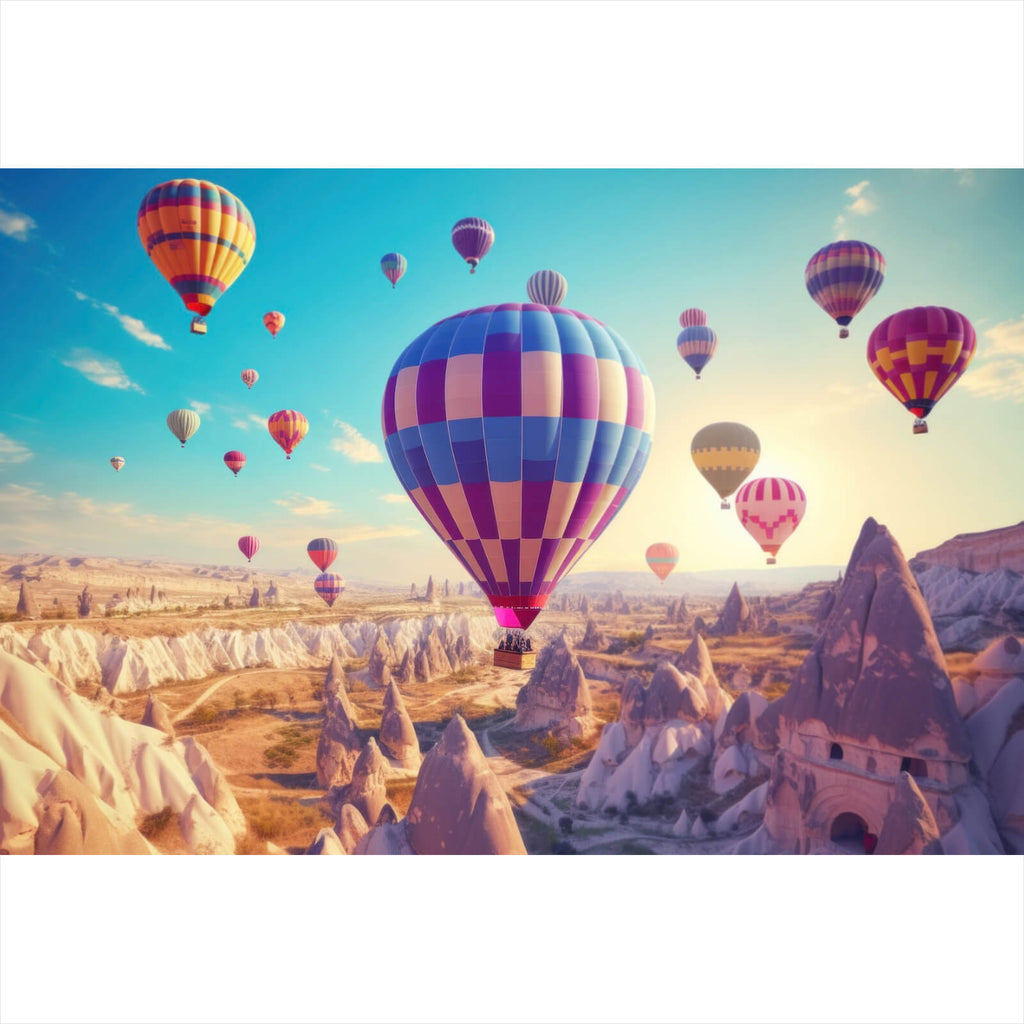 Das Bild zeigt eine eindrucksvolle Szene von zahlreichen Heißluftballons, die majestätisch über eine atemberaubende Landschaft schweben. Die Ballons scheinen förmlich zu tanzen und laden den Betrachter zu einer gedanklichen Reise in die Ferne ein. Die Szenerie vermittelt ein Gefühl von Freiheit und Abenteuerlust, während die Ballons in perfekter Harmonie am Himmel schweben. Die Landschaft darunter erstreckt sich weit und bietet eine spektakuläre Aussicht auf ungewöhnliche Felsformationen, die das Bild noch faszinierender machen. Die harmonische Anordnung der Ballons erzeugt ein Gefühl von Balance und Ruhe, während gleichzeitig der Entdeckergeist geweckt wird. Die Tiefe des Bildes wird durch die Vielzahl der Ballons verstärkt, die in unterschiedlichen Entfernungen und Höhen schweben, was dem Motiv eine dynamische Wirkung verleiht. Dieses Bild ist ideal für alle, die sich von der Schönheit der Natur inspirieren lassen und die Faszination des Fliegens erleben möchten. Es eignet sich perfekt als dekoratives Element in Räumen, die eine Atmosphäre von Freiheit und Erkundung ausstrahlen sollen.
