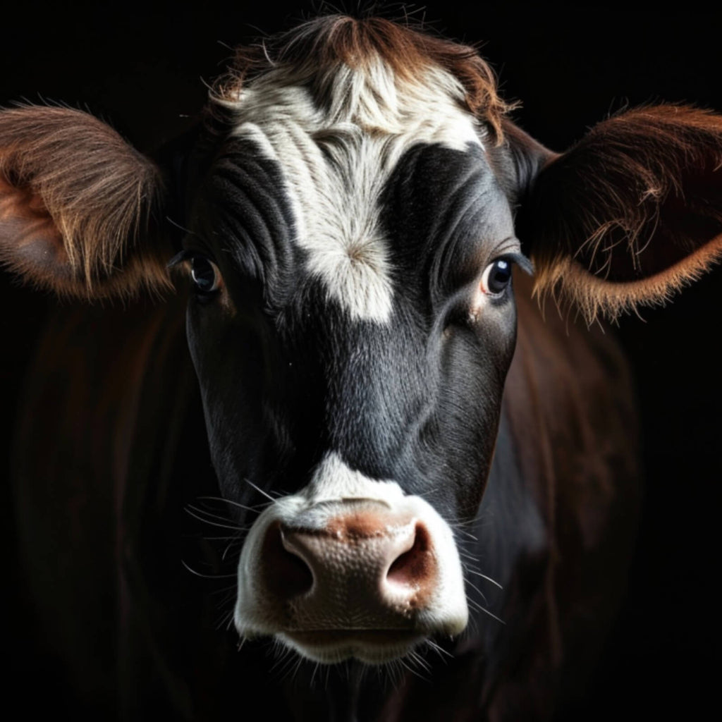 Dieses beeindruckende Wandbild zeigt eine majestätische Kuh in einer faszinierenden Nahaufnahme, die die natürliche Eleganz und Präsenz dieses Tieres perfekt einfängt. Der Fokus liegt auf dem ausdrucksstarken Gesicht der Kuh, dessen detaillierte Darstellung eine tiefe Verbindung zur Natur schafft. Die klaren Linien und die feinen Texturen des Fells verleihen dem Bild eine besondere Tiefe und machen es zu einem herausragenden Kunstwerk. Die minimalistische Farbpalette und der kontrastreiche Hintergrund heben die Konturen der Kuh hervor und sorgen für eine moderne, stilvolle Optik. Diese Fotografie strahlt eine beruhigende Atmosphäre aus und bringt einen Hauch von ländlicher Idylle in jeden Raum. Ideal für moderne Wohnräume oder Büros, zieht dieses Bild die Blicke auf sich und dient als inspirierender Gesprächsanlass. Die Kombination aus Naturthema und künstlerischer Darstellung macht dieses Wandbild zu einer exzellenten Wahl für Kunstliebhaber und Naturliebhaber gleichermaßen.