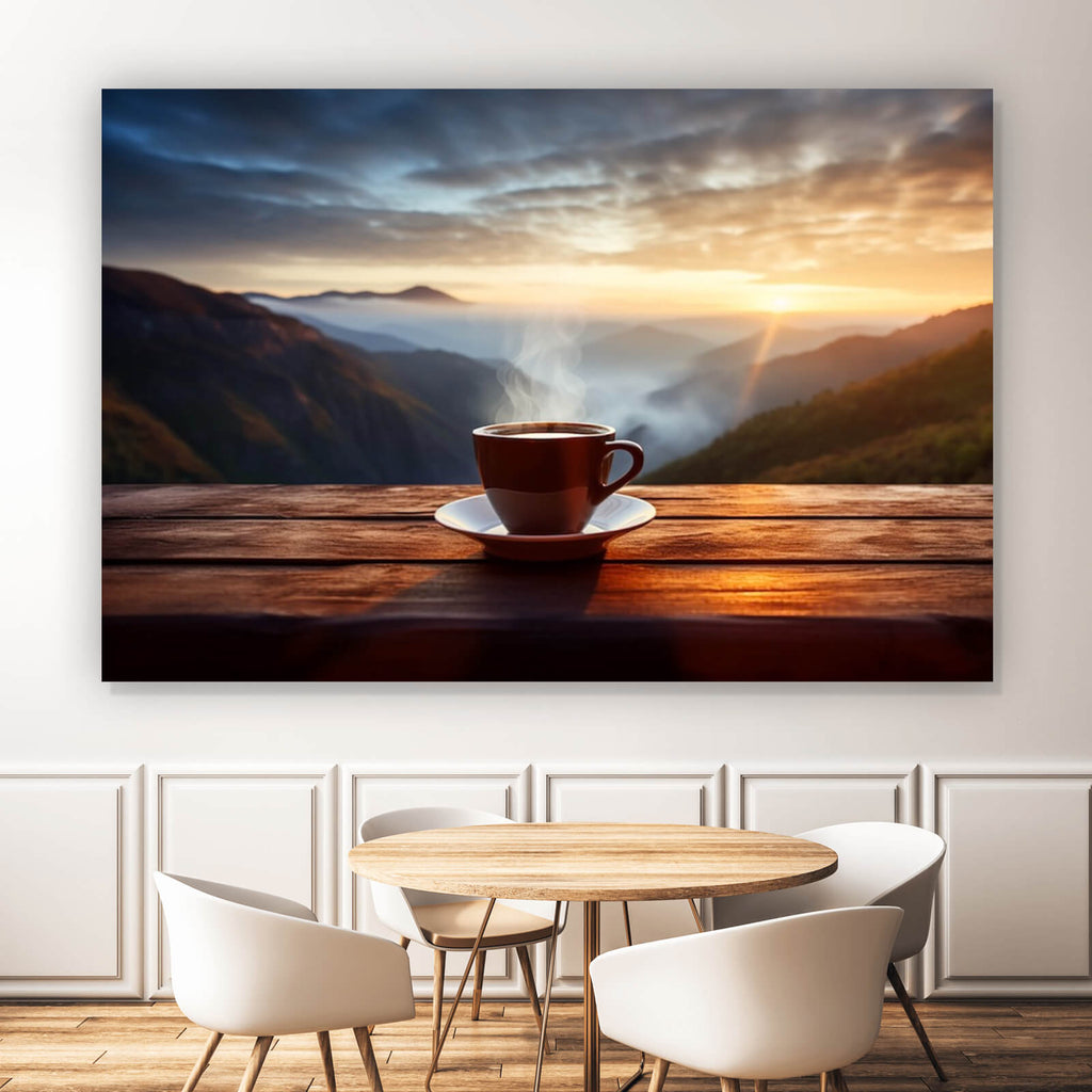 Dieses Wandbild zeigt eine stimmungsvolle Szene, die die Essenz von Ruhe und Gelassenheit einfängt. Im Vordergrund steht eine dampfende Tasse Kaffee, die auf einem rustikalen Holztisch platziert ist. Der Dampf steigt langsam auf und verleiht dem Bild eine lebendige Dynamik. Im Hintergrund erstreckt sich eine majestätische Berglandschaft, die in sanften Hügeln und Tälern verläuft. Die Atmosphäre des Bildes vermittelt ein Gefühl von Entspannung und lädt den Betrachter ein, einen Moment der Ruhe zu genießen. Die Kombination aus der Tasse und der weiten Landschaft schafft eine harmonische Balance zwischen Alltagsgenuss und natürlicher Schönheit. Dieses Bild eignet sich ideal für Räume, in denen eine inspirierende und beruhigende Stimmung gewünscht ist, wie in der Küche oder im Wohnzimmer. Es spricht besonders Menschen an, die eine Verbindung zur Natur suchen und den Genuss eines ruhigen Morgens schätzen. Die Darstellung der Landschaft in Kombination mit der alltäglichen Tasse Kaffee macht dieses Bild zu einem zeitlosen Kunstwerk, das sowohl moderne als auch traditionelle Einrichtungsstile ergänzt.