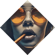 Auf der Suche nach einem ausgefallenen Wandbild als Acrylglasbild? Das Motiv Frau mit Sonnenbrille und Zigarre als Raute gefällt dir und du hast nach Wandbildern mit den Wörtern Kunst, Abstrakt, Portrait, Frau, Sonnenbrille, Zigarre, Cool, Gesicht, Lippen und Rauch gesucht? Dann ist dieses Acrylglasbild in den Farben Braun, Beige, Blau, Grau, Orange und Schwarz genau das richtige Wandbild und Dekorelement für dich! Setze ein Highlight an deiner Wand! Das Acrylglasbild Frau mit Sonnenbrille und Zigarre ist in 4 verschiedenen Größen verfügbar, von klein und dezent bis hin zum XXL Acrylglasbild.