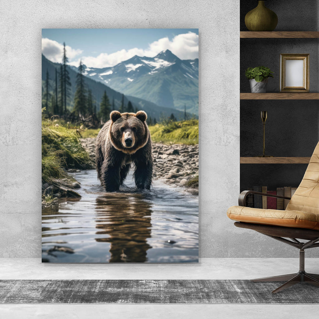 Dieses beeindruckende Wandbild zeigt einen mächtigen Bären, der durch eine natürliche Landschaft schreitet. Im Vordergrund des Bildes dominiert der Bär, dessen imposante Gestalt und kraftvolle Präsenz die Aufmerksamkeit des Betrachters fesseln. Er bewegt sich durch einen flachen Fluss, dessen Wasser die Umgebung sanft widerspiegelt. Im Hintergrund erheben sich majestätische Berge, die eine beeindruckende Kulisse bieten und das Gefühl von Freiheit und Abenteuer verstärken. Die tiefen Wälder auf beiden Seiten des Flusses vervollständigen die Szenerie und schaffen eine Atmosphäre der Ruhe und Gelassenheit. Die Detailgenauigkeit der Darstellung lässt die Texturen des Fells und die natürlichen Elemente der Umgebung lebendig erscheinen. Dieses Kunstwerk ist ideal geeignet, um in Räumen wie Wohnzimmer oder Büro eine beruhigende und zugleich inspirierende Wirkung zu entfalten. Es spricht Naturliebhaber und Abenteuerlustige gleichermaßen an und vermittelt ein Gefühl von Erkundung und Verbundenheit mit der Wildnis. Durch die harmonische Komposition und die kraftvolle Symbolik des Bären wird dieses Bild zu einem Blickfang, der sowohl Stärke als auch Gelassenheit ausstrahlt.