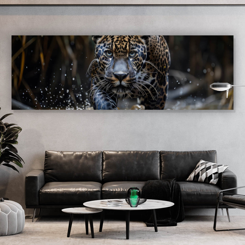Dieses beeindruckende Wandbild zeigt einen mächtigen Jaguar in dynamischer Bewegung durch das Wasser, ein Motiv, das Stärke und Eleganz vereint. Der Jaguar, ein Symbol für Wildnis und Kraft, ist in einer eindrucksvollen Pose eingefangen, die seine majestätische Präsenz und die geschmeidige Anmut seiner Bewegungen betont. Die Szene vermittelt ein Gefühl von Intensität und Spannung, während der Jaguar durch das spritzende Wasser pflügt, jeder Muskel gespannt und bereit für den nächsten Schritt. Die Details im Fell und die scharfen Konturen des Gesichts heben die natürliche Schönheit und Exotik dieses Raubtiers hervor. Die Darstellung der Wassertropfen in der Luft verstärkt den Eindruck von Dynamik und Energie, während der Hintergrund subtil zurücktritt, um den Fokus auf das Tier zu lenken. Dieses Bild fängt die Essenz von Abenteuer und Wildnis ein, perfekt für Räume, die eine Verbindung zur Natur und eine Atmosphäre von Stärke und Entschlossenheit fördern möchten. Die harmonische Kombination der Elemente macht es zu einem idealen Kunstwerk für eine moderne und stilvolle Einrichtung.