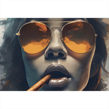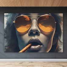 Auf der Suche nach einem ausgefallenen Wandbild als Aluminiumbild gebürstet? Das Motiv Frau mit Sonnenbrille und Zigarre im Querformat gefällt dir und du hast nach Wandbildern mit den Wörtern Kunst, Abstrakt, Portrait, Frau, Sonnenbrille, Zigarre, Cool, Gesicht, Lippen und Rauch gesucht? Dann ist dieses Aluminiumbild gebürstet in den Farben Braun, Beige, Blau, Grau, Orange und Schwarz genau das richtige Wandbild und Dekorelement für dich! Setze ein Highlight an deiner Wand! Das Aluminiumbild gebürstet Frau mit Sonnenbrille und Zigarre ist in 4 verschiedenen Größen verfügbar, von klein und dezent bis hin zum XXL Aluminiumbild gebürstet.