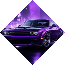 Das Bild zeigt einen markanten lila Sportwagen, der prominent im Vordergrund steht. Der Wagen, mit seinen eleganten Linien und kraftvollen Scheinwerfern, vermittelt ein Gefühl von Geschwindigkeit und Stärke. Er ist auf einer nassen, glänzenden Straße positioniert, was durch die Reflexionen der Stadtlichter auf dem Asphalt verstärkt wird. Im Hintergrund erhebt sich eine beeindruckende Stadtsilhouette, dominiert von hohen Gebäuden, darunter das ikonische Chrysler Building, das im lila Neonlicht erstrahlt. Die Szenerie ist in tiefes Lila getaucht, was eine futuristische und fast surreal anmutende Atmosphäre schafft. Die Mischung aus urbaner Architektur und modernem Automobildesign betont das Thema von Fortschritt und urbanem Lifestyle. Die Lichter der Stadt und der Nebel verleihen dem Bild eine geheimnisvolle und gleichzeitig energiegeladene Stimmung, die die Dynamik und den Puls einer Metropole in der Nacht einfängt.
