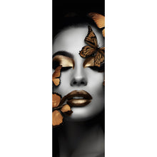 Auf der Suche nach einem ausgefallenen Wandbild als Aluminiumbild? Das Motiv Portrait einer Frau mit goldenen Schmetterlingen im Panorama Hoch gefällt dir und du hast nach Wandbildern mit den Wörtern Frau, Portrait, Gold, Kupfer, Schmetterling, Glamour, Eleganz, Stil, Modern, Schönheit, Insekt und Make-up gesucht? Dann ist dieses Aluminiumbild in den Farben Schwarz, Grau, Gold und Orange genau das richtige Wandbild und Dekorelement für dich! Setze ein Highlight an deiner Wand! Das Aluminiumbild Portrait einer Frau mit goldenen Schmetterlingen ist in 4 verschiedenen Größen verfügbar, von klein und dezent bis hin zum XXL Aluminiumbild.
