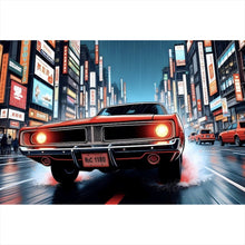 Das Bild zeigt eine dynamische und lebendige Szene in einer neonbeleuchteten Großstadt, bei der ein klassisches Auto im Vordergrund durch die nächtlichen Straßen fährt. Der Asphalt glänzt wegen des Regens, und die Scheinwerfer des Fahrzeugs werfen helle Lichtstrahlen auf die nasse Straße, die sich in beeindruckenden Reflexionen widerspiegeln. Die Umgebung ist von hohen Gebäuden gesäumt, die mit auffälligen, bunten Neonlichtern und Schildern verziert sind. Diese Lichter verleihen der Szenerie eine futuristische und zugleich nostalgische Atmosphäre, die an bekannte urbane Zentren wie Tokio erinnert. Die Kombination aus Retro-Auto und moderner Stadtlandschaft schafft eine faszinierende Spannung zwischen Vergangenheit und Gegenwart. Im Hintergrund sind weitere Autos zu sehen, die die belebte, schnelllebige Natur dieser Metropole unterstreichen. Die Details der Architektur und die Vielzahl von Schildern geben einen Eindruck von der kulturellen Vielfalt und Dynamik der Stadt. Das Bild fängt perfekt die Essenz des urbanen Nachtlebens ein und zieht den Betrachter in eine Welt voller Energie und Bewegung.
