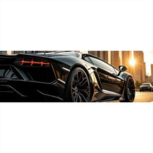 Das Bild zeigt einen luxuriösen schwarzen Sportwagen, der majestätisch eine breite Straße entlangfährt, während die untergehende Sonne den Himmel in goldene Töne taucht. Im Hintergrund ragen beeindruckende Wolkenkratzer in den Himmel, die die urbane Landschaft dominieren. Diese Hochhäuser reflektieren das warme Licht des Sonnenuntergangs, was ihnen einen schimmernden Glanz verleiht. Die Straße, auf der der Sportwagen fährt, ist glatt und gut gepflegt, was den Eindruck von Geschwindigkeit und Eleganz verstärkt. Der Sportwagen selbst ist ein Meisterwerk moderner Automobiltechnik, mit scharfen Linien und einem aerodynamischen Design, das sowohl Leistung als auch Stil verkörpert. Die Szene vermittelt ein Gefühl von Dynamik und Exklusivität, wobei die Kombination aus dem beeindruckenden Fahrzeug und der urbanen Umgebung ein Bild von Luxus und modernem Stadtleben zeichnet. Die warme Abendbeleuchtung verstärkt den dramatischen Effekt und lässt den Betrachter die Harmonie zwischen Mensch und Architektur in einer modernen Metropole spüren.
