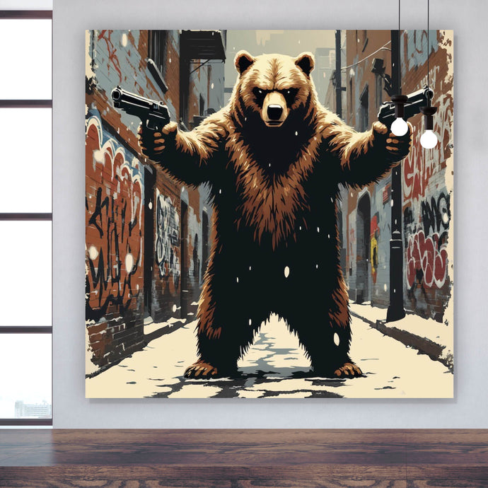 Aluminiumbild gebürstet Bewaffneter Bär in schneebedeckter Stadtgasse Raute