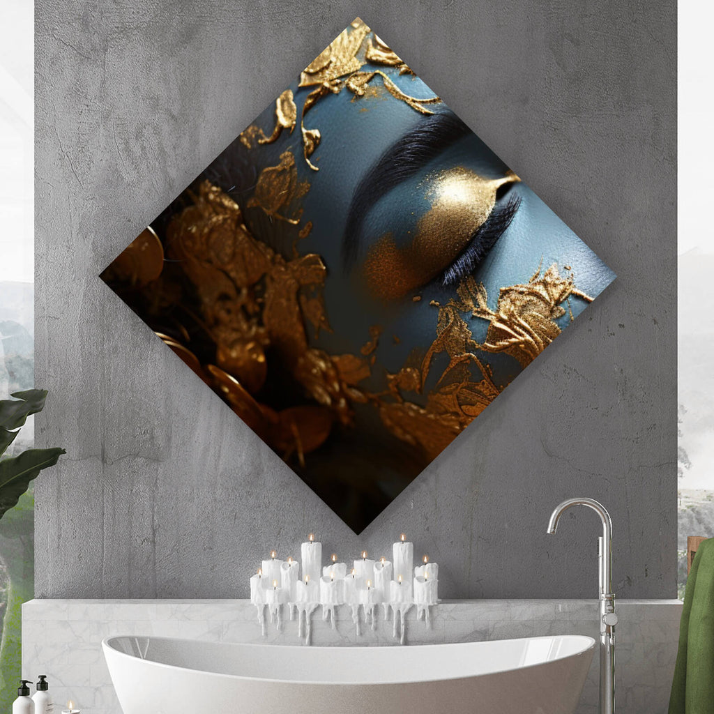 Dieses beeindruckende Wandbild zeigt ein edles Gesicht voller Ausdruck und Eleganz, das mit kunstvollen goldenen Details verziert ist. Die feinen, glänzenden Akzente auf der Haut verleihen dem Motiv eine luxuriöse Anmutung und ziehen den Betrachter unweigerlich in ihren Bann. Die Komposition spielt mit dem Kontrast zwischen den weichen Gesichtszügen und den filigranen, fast mystischen Ornamenten, die sich über die Haut erstrecken. Der Stil des Bildes strahlt Ruhe und Harmonie aus und eignet sich perfekt als meditativer Blickfang in jedem Raum. Die Tiefe und die präzise Darstellung der Details lassen das Portrait fast lebendig erscheinen und schaffen eine faszinierende Raumwirkung. Ob im Wohnzimmer, Schlafzimmer oder Büro, dieses Kunstwerk setzt einen stilvollen Akzent und lädt zur Inspiration und Kontemplation ein. Die harmonische Verbindung von Modernität und spirituellen Elementen macht es zu einem zeitlosen Dekorationsstück, das sowohl Ästhetik als auch eine tiefere Bedeutung vermittelt.