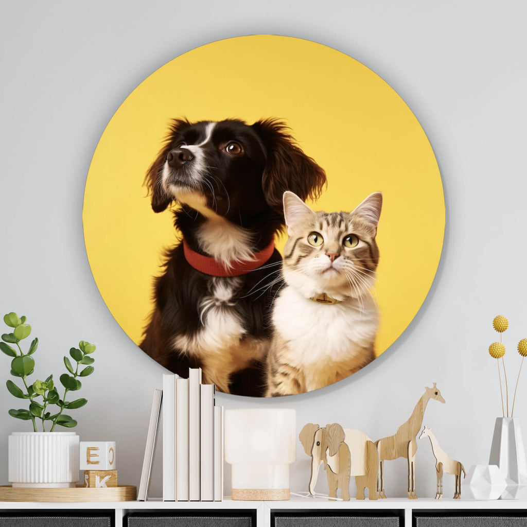 Auf der Suche nach einem ausgefallenen Wandbild als Aluminiumbild gebürstet? Das Motiv Hund und Katze vor gelbem Hintergrund als Kreis gefällt dir und du hast nach Wandbildern mit den Wörtern Haustiere, Hund, Katze, Tierfotografie, Hundebild, Katzenbild, Freundschaft, Tierfreunde, Tierportrait, Haustierfoto, Haustierpflege, Tierliebhaber und Tiere gesucht? Dann ist dieses Aluminiumbild gebürstet in den Farben Gelb, Braun, Weiß und Grau genau das richtige Wandbild und Dekorelement für dich! Setze ein Highlight an deiner Wand! Das Aluminiumbild gebürstet Hund und Katze vor gelbem Hintergrund ist in 5 verschiedenen Größen verfügbar, von klein und dezent bis hin zum XXL Aluminiumbild gebürstet.
