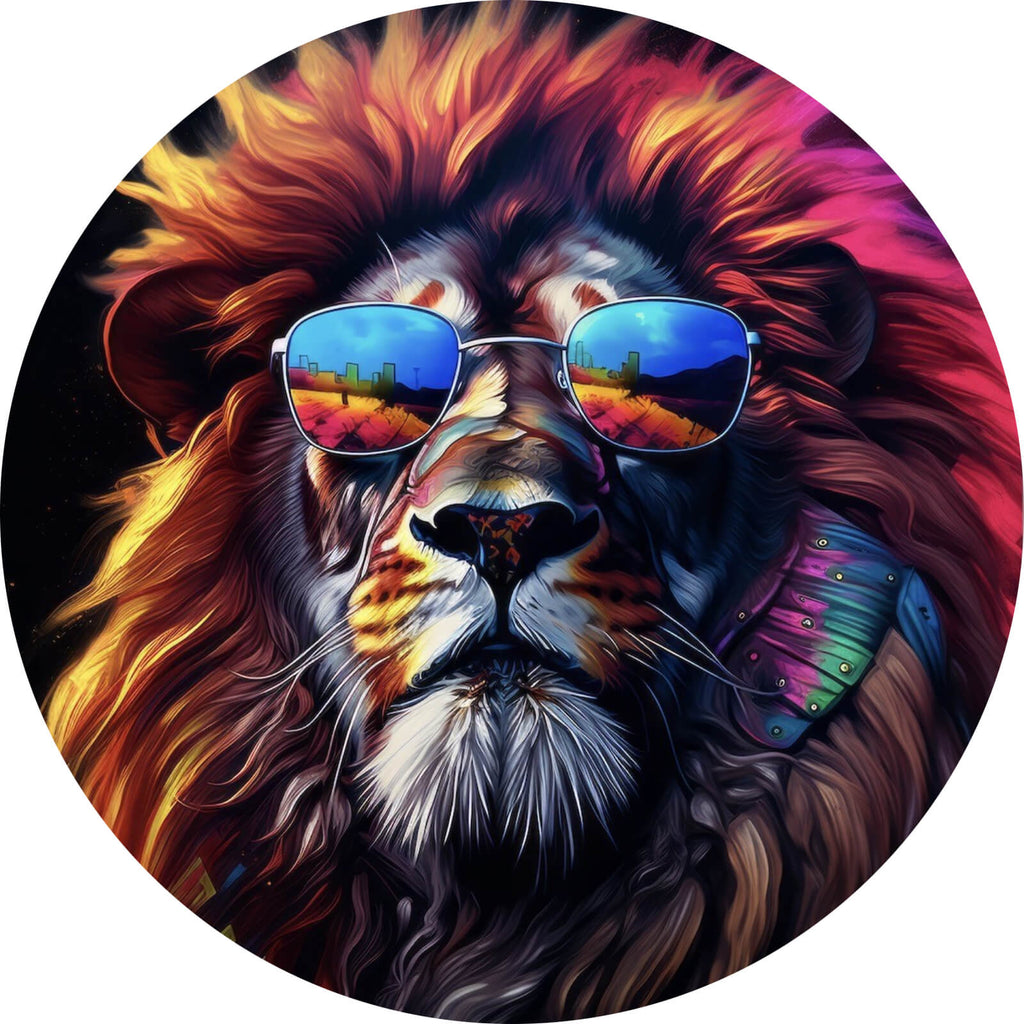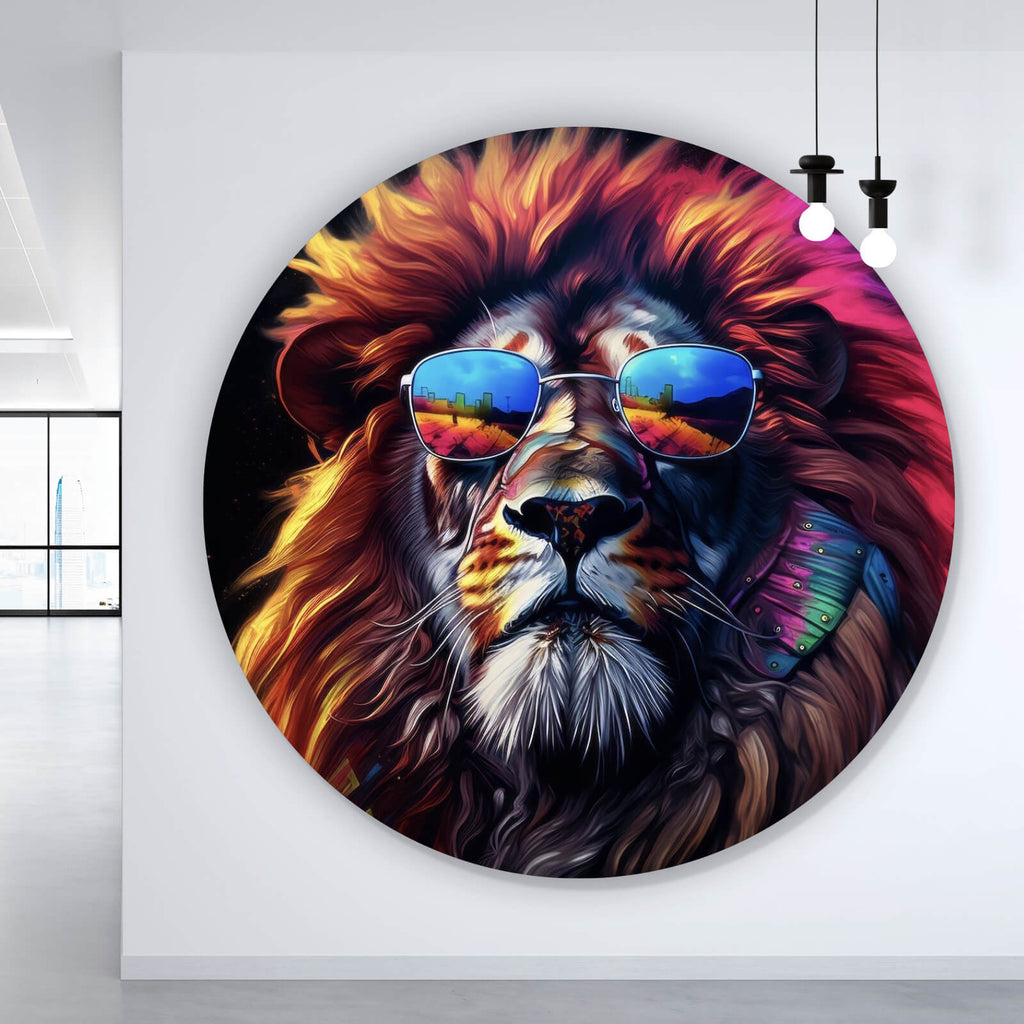 Aluminiumbild gebürstet Löwe mit Sonnenbrille und bunte Mähne Kreis
