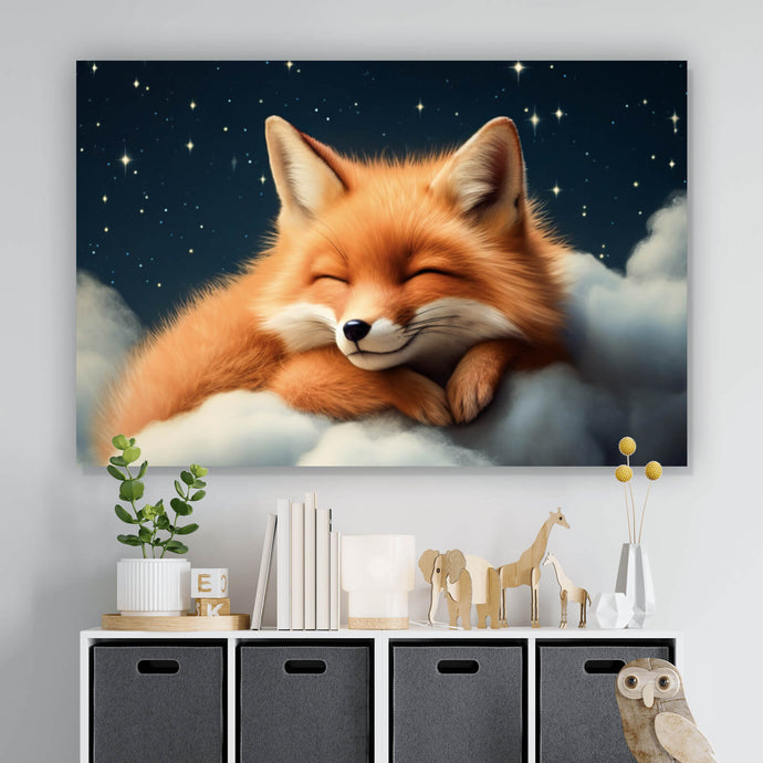 Aluminiumbild Schlafender Fuchs auf Wolken unter funkelndem Sternenhimmel Querformat