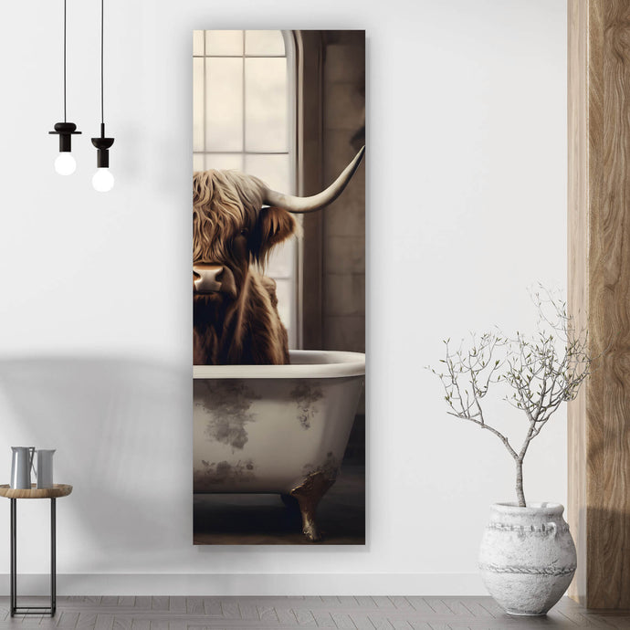 Aluminiumbild Hochlandrind in der Badewanne Vintage Hochformat
