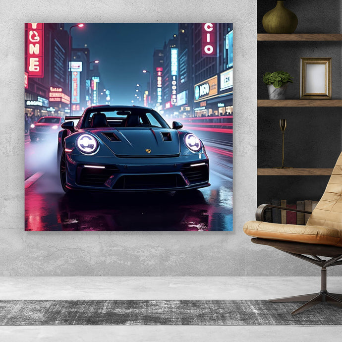 Aluminiumbild Sportwagen bei Nacht in neonbeleuchteter Stadtstraße Raute
