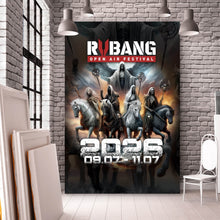 Das Bild zeigt eine dramatische und atmosphärische Darstellung eines Open Air Musikfestivals, das als „Rvbang Open Air Festival“ beworben wird. Im Vordergrund sind vier apokalyptische Reiter zu sehen, die auf mächtigen Pferden reiten. Diese Reiter sind in dunkle Gewänder gehüllt und tragen bedrohlich wirkende Stäbe oder Waffen. Die Pferde, auf denen sie reiten, scheinen aus einer anderen Welt zu stammen, mit leuchtenden Augen und muskulösen Körpern. Über den Reitern erhebt sich eine bedrohliche Gestalt mit weit ausgebreiteten Flügeln, die den Himmel dominiert. Der Hintergrund ist in düsteren, stürmischen Farben gehalten, die eine apokalyptische Stimmung erzeugen. Am unteren Rand des Bildes befindet sich die Jahreszahl „2026“, gefolgt von den Daten „09.07 - 11.07“, was das Datum des Festivals anzeigt. Die Gesamtkomposition des Bildes vermittelt ein Gefühl von Spannung und Vorfreude, das perfekt zu einem großen, epischen Musikfestival passt. Die visuelle Darstellung spricht Fans von dramatischer und fantastischer Kunst an, die ein intensives Musikerlebnis erwarten.