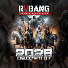 Das Bild zeigt eine dramatische und atmosphärische Darstellung eines Open Air Musikfestivals, das als „Rvbang Open Air Festival“ beworben wird. Im Vordergrund sind vier apokalyptische Reiter zu sehen, die auf mächtigen Pferden reiten. Diese Reiter sind in dunkle Gewänder gehüllt und tragen bedrohlich wirkende Stäbe oder Waffen. Die Pferde, auf denen sie reiten, scheinen aus einer anderen Welt zu stammen, mit leuchtenden Augen und muskulösen Körpern. Über den Reitern erhebt sich eine bedrohliche Gestalt mit weit ausgebreiteten Flügeln, die den Himmel dominiert. Der Hintergrund ist in düsteren, stürmischen Farben gehalten, die eine apokalyptische Stimmung erzeugen. Am unteren Rand des Bildes befindet sich die Jahreszahl „2026“, gefolgt von den Daten „09.07 - 11.07“, was das Datum des Festivals anzeigt. Die Gesamtkomposition des Bildes vermittelt ein Gefühl von Spannung und Vorfreude, das perfekt zu einem großen, epischen Musikfestival passt. Die visuelle Darstellung spricht Fans von dramatischer und fantastischer Kunst an, die ein intensives Musikerlebnis erwarten.