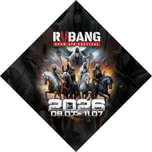 Das Bild zeigt eine dramatische und atmosphärische Darstellung eines Open Air Musikfestivals, das als „Rvbang Open Air Festival“ beworben wird. Im Vordergrund sind vier apokalyptische Reiter zu sehen, die auf mächtigen Pferden reiten. Diese Reiter sind in dunkle Gewänder gehüllt und tragen bedrohlich wirkende Stäbe oder Waffen. Die Pferde, auf denen sie reiten, scheinen aus einer anderen Welt zu stammen, mit leuchtenden Augen und muskulösen Körpern. Über den Reitern erhebt sich eine bedrohliche Gestalt mit weit ausgebreiteten Flügeln, die den Himmel dominiert. Der Hintergrund ist in düsteren, stürmischen Farben gehalten, die eine apokalyptische Stimmung erzeugen. Am unteren Rand des Bildes befindet sich die Jahreszahl „2026“, gefolgt von den Daten „09.07 - 11.07“, was das Datum des Festivals anzeigt. Die Gesamtkomposition des Bildes vermittelt ein Gefühl von Spannung und Vorfreude, das perfekt zu einem großen, epischen Musikfestival passt. Die visuelle Darstellung spricht Fans von dramatischer und fantastischer Kunst an, die ein intensives Musikerlebnis erwarten.