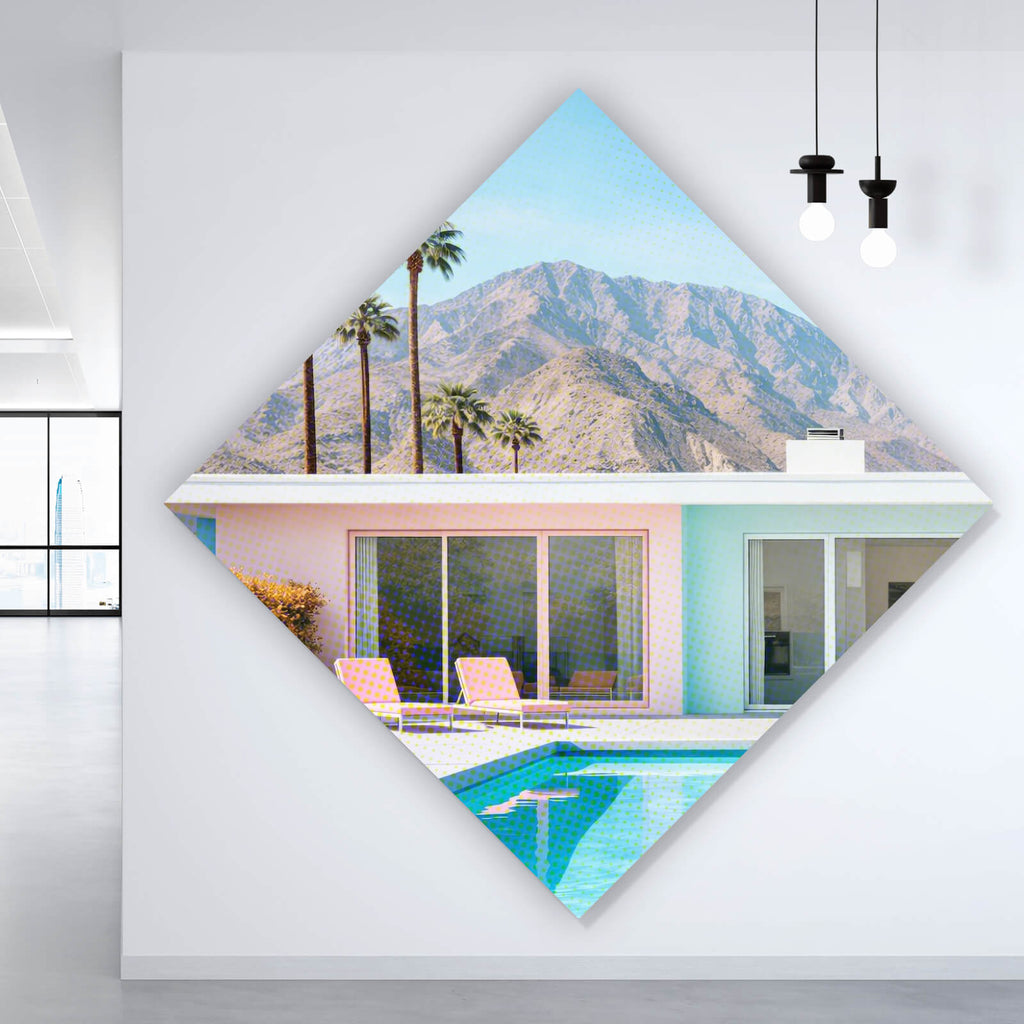 Das Leinwandbild Modernes Poolhaus mit Palmen und Bergkulisse als Raute hat eine matte Oberfläche und wird auf qualitativ hochwertigem Canvas-Leinenstoff mit 260 g/m² digital gedruckt. Das Leinwandbild wird anschließend auf einen 2 cm starken Holzrahmen aufgebracht und rückseitig gespannt. Die Ecken werden fachgerecht umgeschlagen. Das Leinwandbild wird fertig montiert zu dir geliefert. Leinwandbilder sind eine preiswerte Art, deinen Raum in ein Highlight zu verwandeln und erzielen durch die Tiefe eine tolle 3D-Wirkung. Auch super geeignet zum Abdecken der Haustechnik wie Stromkästen. Leinwandbilder, die auch nach Jahren noch wie neu aussehen und strahlen.