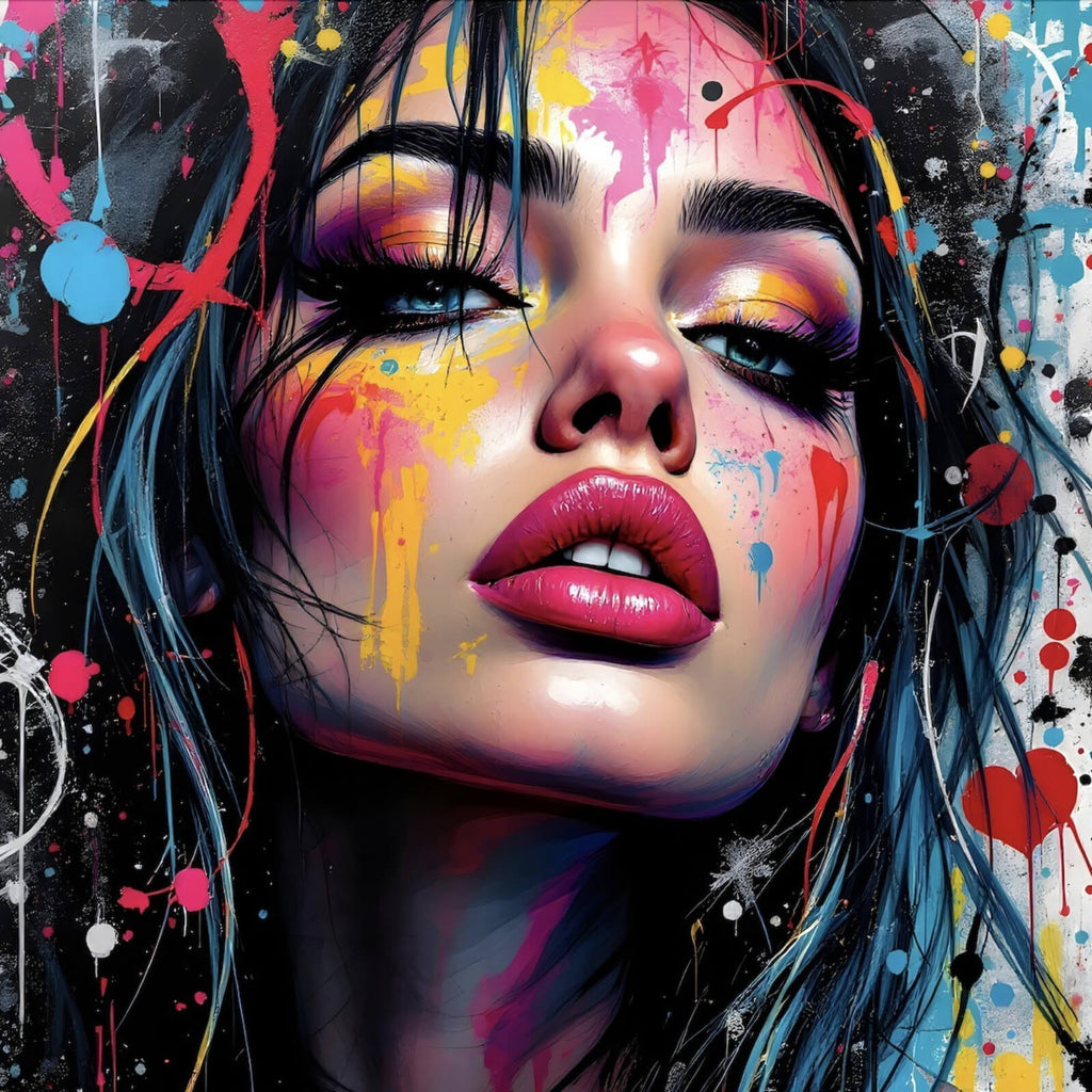 Dieses beeindruckende Kunstwerk ist ein ausdrucksstarkes Porträt im Pop Art Stil, das mit seiner lebendigen und dynamischen Darstellung die Aufmerksamkeit auf sich zieht. Das Motiv zeigt ein Gesicht, das durch die Kombination von abstrakten Elementen und präzise gesetzten Akzenten eine einzigartige Tiefe erhält. Die Komposition spielt mit verschiedenen Formen und Linien, die dem Bild eine moderne und kreative Anmutung verleihen. Die Darstellung ist sowohl detailreich als auch stilisiert, was die Individualität und Ausdruckskraft des Werkes unterstreicht. Durch die Verwendung von kräftigen Konturen und pointierten Details wird eine starke visuelle Wirkung erzielt, die in jedem Raum als zentraler Blickfang dient. Dieses Wandbild eignet sich hervorragend für moderne Wohnräume oder Büros, in denen es eine inspirierende Atmosphäre schafft. Die Ästhetik des Bildes kombiniert künstlerische Freiheit mit strukturiertem Design, wodurch es sowohl in minimalistischen als auch in lebendig gestalteten Umgebungen zur Geltung kommt. Ein perfektes Beispiel für zeitgenössische Kunst, die sowohl Stilbewusstsein als auch Originalität verkörpert.