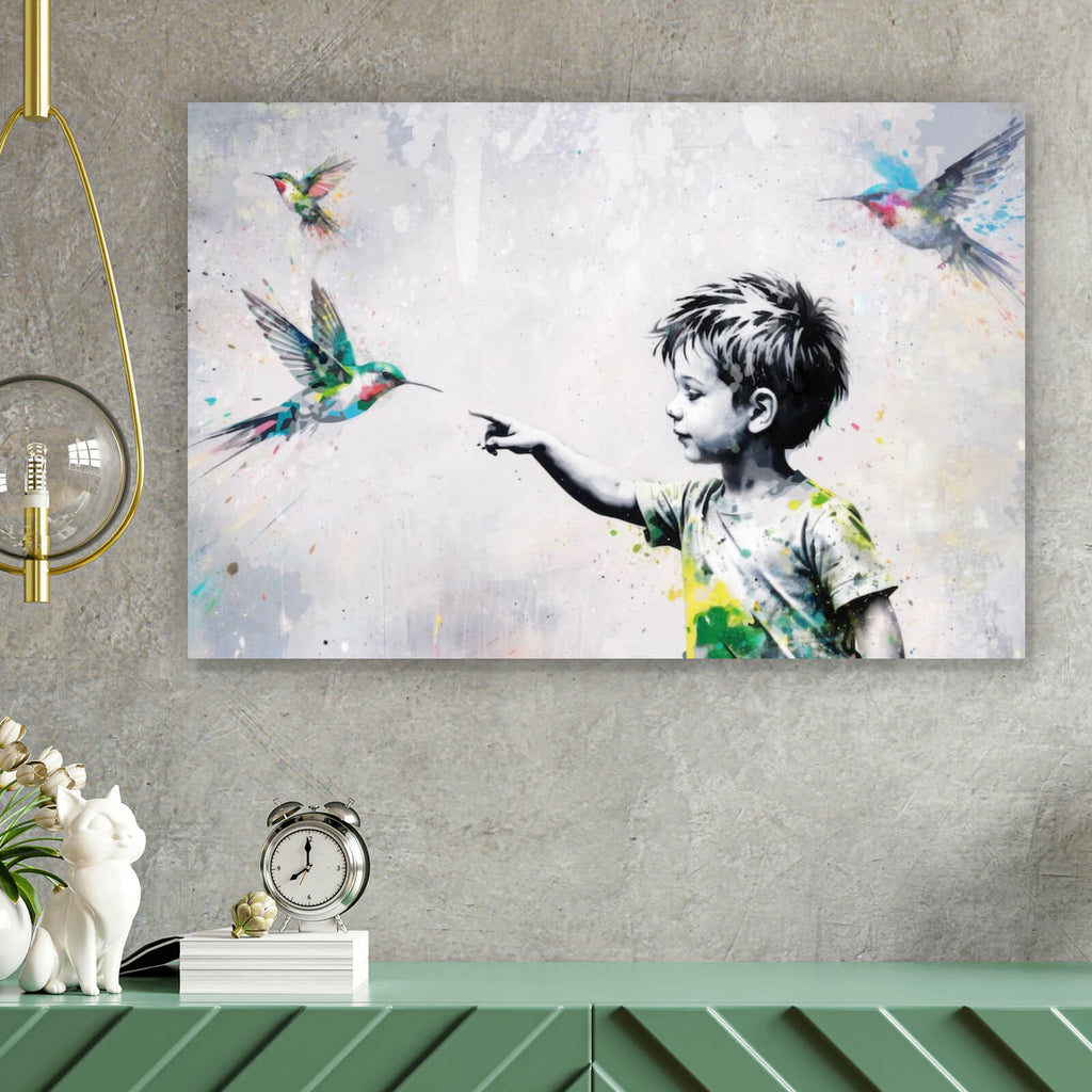 Auf der Suche nach einem ausgefallenen Wandbild als Leinwandbild? Das Motiv Kind berührt Vögel im Querformat gefällt dir und du hast nach Wandbildern mit den Wörtern Kind, Kindheit, Kolibri, Vögel, Anziehung, Kreativ, Atmosphäre, Inspiration, Dynamik, Ausdruck, Lebhaft und Pop Art gesucht? Dann ist dieses Leinwandbild in der Farbe Bunt genau das richtige Wandbild und Dekorelement für dich! Setze ein Highlight an deiner Wand! Das Leinwandbild Kind berührt Vögel ist in 4 verschiedenen Größen verfügbar, von klein und dezent bis hin zum XXL Leinwandbild.