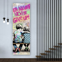 Das Bild zeigt zwei Kinder, die eng nebeneinander auf einer Holzbank sitzen. Sie sind von hinten zu sehen, der Junge legt seinen Arm um das Mädchen, was ein Gefühl von Freundschaft und Zusammenhalt vermittelt. Beide tragen legere Kleidung, die mit bunten Farbspritzern verziert ist, was dem Bild eine lebendige und künstlerische Note verleiht. Neben dem Jungen sitzt ein kleiner Hund, der aufmerksam in die gleiche Richtung wie die Kinder schaut. Rechts von der Bank schwebt ein roter Herzballon, der durch eine Schnur mit dem Boden verbunden ist. Im Hintergrund ist eine Wand zu sehen, die mit verschiedenen Graffiti und Farbflecken übersät ist. Dominant erscheint der Schriftzug „NEVER NEVER NEVER GIVE UP!“ in kräftigem Pink, der als zentrale Botschaft des Bildes fungiert und den Betrachter zu Optimismus und Ausdauer ermutigt. Die Verwendung von leuchtenden Farben und dynamischen Elementen verleiht dem Bild eine positive und energiegeladene Atmosphäre. Die Szene erinnert an die Werke von Streetart-Künstlern und vermittelt eine starke Botschaft der Hoffnung und des nie aufgebenden Geistes. Die Kombination aus kindlicher Unschuld, Kunst und motivierenden Worten macht das Bild zu einem inspirierenden Kunstwerk, das sowohl ästhetisch ansprechend als auch emotional berührend ist.