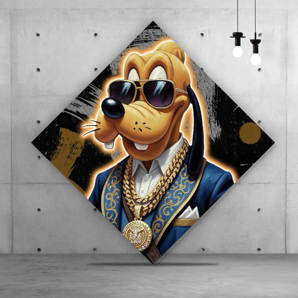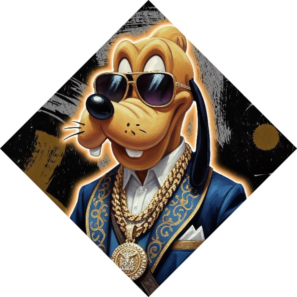 Das Bild zeigt einen stilvollen Cartoonhund, der mit seiner eleganten Erscheinung beeindruckt. Der Hund trägt eine modische Sonnenbrille, die ihm einen coolen, selbstbewussten Look verleiht. Sein blauer Anzug ist mit goldenen Verzierungen geschmückt, die einen luxuriösen Eindruck erzeugen. Um den Hals trägt er mehrere goldene Ketten, die seinen reichen und extravaganten Lebensstil betonen. Diese Kombination von Accessoires und Kleidung verleiht ihm einen einzigartigen und trendigen Stil. Die Illustration ist in einem lebendigen, bunten Stil gehalten, der die Details des Outfits hervorhebt und die Persönlichkeit des Charakters unterstreicht. Der Hintergrund ist schwarz mit künstlerischen Elementen, die den Fokus auf den Hund lenken. Dieses Bild spricht Liebhaber von Popkultur und Mode an, da es eine Verschmelzung von Comic-Charakter und High-Fashion darstellt. Es ist ein perfektes Beispiel für kreatives Design und modische Kunst, das Aufmerksamkeit auf sich zieht und in der digitalen Kunstszene relevant ist.