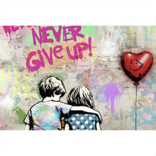 Das Bild zeigt zwei Kinder, die eng nebeneinander auf einer Holzbank sitzen. Sie sind von hinten zu sehen, der Junge legt seinen Arm um das Mädchen, was ein Gefühl von Freundschaft und Zusammenhalt vermittelt. Beide tragen legere Kleidung, die mit bunten Farbspritzern verziert ist, was dem Bild eine lebendige und künstlerische Note verleiht. Neben dem Jungen sitzt ein kleiner Hund, der aufmerksam in die gleiche Richtung wie die Kinder schaut. Rechts von der Bank schwebt ein roter Herzballon, der durch eine Schnur mit dem Boden verbunden ist. Im Hintergrund ist eine Wand zu sehen, die mit verschiedenen Graffiti und Farbflecken übersät ist. Dominant erscheint der Schriftzug „NEVER NEVER NEVER GIVE UP!“ in kräftigem Pink, der als zentrale Botschaft des Bildes fungiert und den Betrachter zu Optimismus und Ausdauer ermutigt. Die Verwendung von leuchtenden Farben und dynamischen Elementen verleiht dem Bild eine positive und energiegeladene Atmosphäre. Die Szene erinnert an die Werke von Streetart-Künstlern und vermittelt eine starke Botschaft der Hoffnung und des nie aufgebenden Geistes. Die Kombination aus kindlicher Unschuld, Kunst und motivierenden Worten macht das Bild zu einem inspirierenden Kunstwerk, das sowohl ästhetisch ansprechend als auch emotional berührend ist.