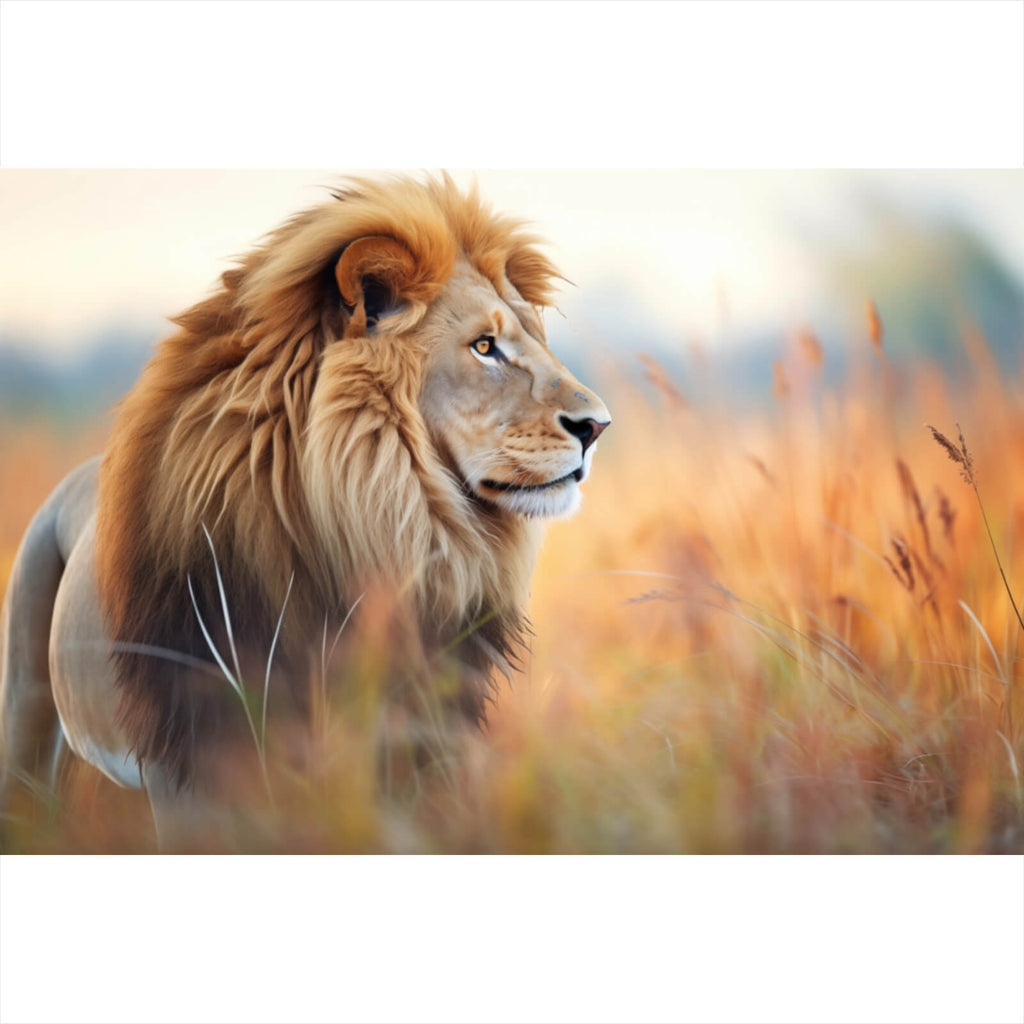 Dieses beeindruckende Wandbild zeigt einen majestätischen Löwen, der in seiner natürlichen Umgebung verweilt. Der Löwe ist in einer ruhigen und dennoch kraftvollen Pose dargestellt, die seine Stärke und Anmut hervorhebt. Seine Mähne ist detailliert und voluminös, was ihm eine königliche Erscheinung verleiht. Das Bild fängt die Essenz der Wildnis ein und vermittelt ein Gefühl von Freiheit und Abenteuer. Der Hintergrund zeigt eine sanfte, verschwommene Landschaft, die den Fokus auf den Löwen verstärkt und ihm eine zentrale Rolle verleiht. Die Komposition des Bildes ist harmonisch und ausgewogen, was es zu einem idealen Kunstwerk für verschiedene Räume macht. Es zieht den Betrachter in die Welt der Savanne und bietet eine visuelle Flucht in die unberührte Natur. Dieses Bild eignet sich perfekt als Dekoration für Wohnzimmer, Büros oder Schlafzimmer und bringt ein Stück der wilden Schönheit Afrikas in den Raum. Die detaillierte Darstellung und der künstlerische Stil machen es zu einem zeitlosen Kunstwerk, das sowohl Modernität als auch klassische Eleganz ausstrahlt.