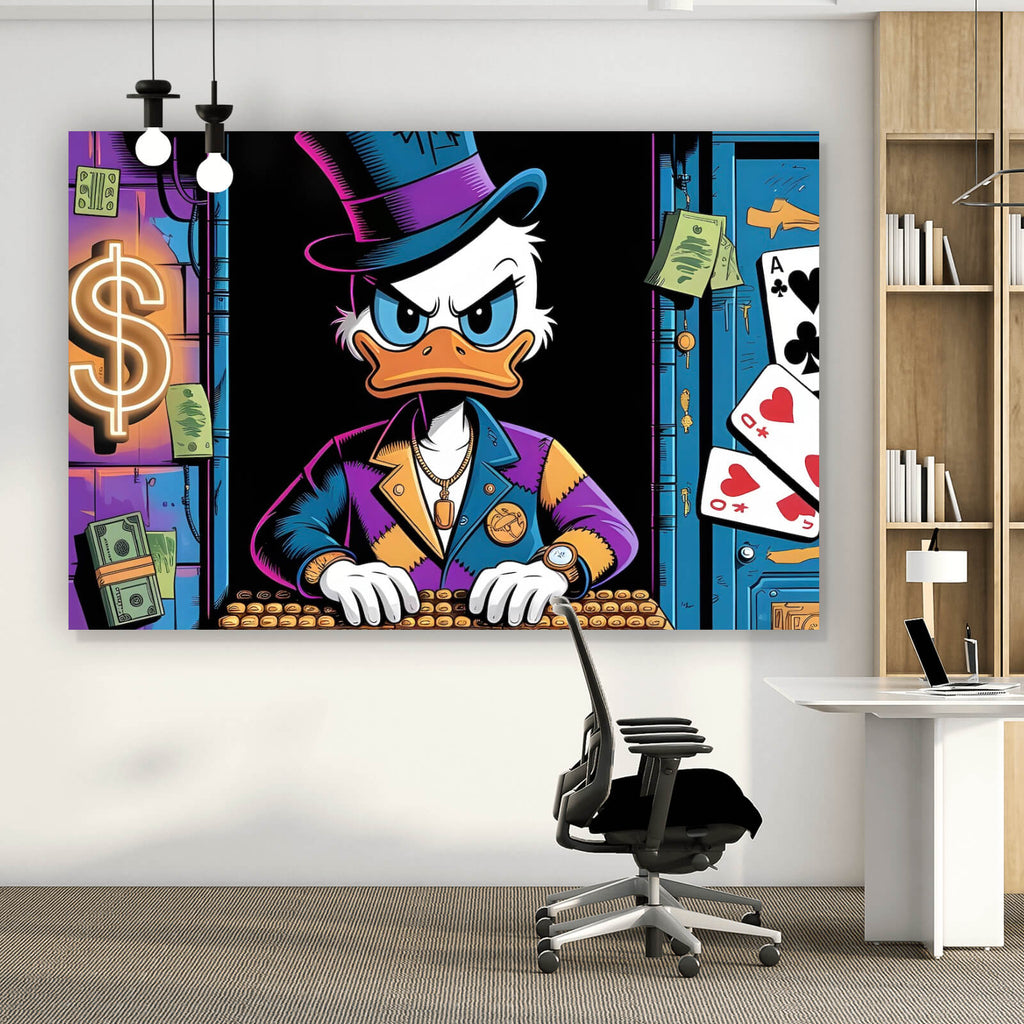Dieses eindrucksvolle Wandbild zeigt ein charakteristisches Entenmotiv, das in einer modernen und pop-artigen Stilrichtung gestaltet ist. Die Ente, gekleidet in einem stilvollen Anzug mit Zylinder, sitzt vor einem Tisch voller Münzen, was einen starken Bezug zu Themen wie Reichtum und Investition herstellt. Umgeben von Geldsymbolen und Spielkarten entsteht eine spielerische, humorvolle Atmosphäre, die gleichzeitig Luxus und Kreativität ausstrahlt. Die Komposition ist dynamisch, mit klaren Linien und einem harmonischen Aufbau, der die Blicke auf sich zieht und jedes Zimmer, ob Wohnzimmer, Büro oder Hobbyraum, bereichert. Das Bild vermittelt eine Botschaft von Wohlstand und Erfolg und dient als ausdrucksstarkes Statement-Piece. Die künstlerische Umsetzung im Cartoon-Stil verleiht der Darstellung einen humorvollen Touch, der sowohl Sammler als auch Kunstliebhaber anspricht. Die moderne Materialanmutung und die lebendige Darstellung sorgen für eine intensive Raumwirkung, die eine inspirierende und zugleich unterhaltsame Stimmung schafft. Dieses Wandbild ist perfekt für alle, die nach einem einzigartigen und kreativen Dekorationselement suchen, das gleichzeitig Stil und Persönlichkeit vermittelt.