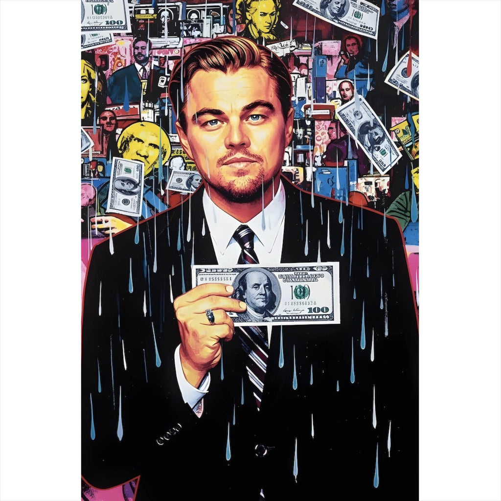 Das Bild zeigt einen Mann in einem schwarzen Anzug mit Krawatte, der einen 100-Dollar-Schein in den Händen hält. Der Hintergrund ist eine lebendige Collage aus verschiedenen Pop-Art-Elementen und Bildern, die in kräftigen Farben wie Blau, Rot und Gelb gestaltet sind. Über dem gesamten Bild scheinen Dollar-Scheine in unterschiedlichen Ausrichtungen und Größen herabzufallen, was einen dynamischen und fast surrealen Effekt erzeugt. Der Mann wirkt konzentriert und selbstbewusst, als würde er die Bedeutung des Geldes und dessen Einfluss symbolisieren. Die verschiedenen Gesichter und Figuren im Hintergrund könnten auf unterschiedliche Persönlichkeiten oder historische Figuren hinweisen, die einen Einfluss auf den gesellschaftlichen oder wirtschaftlichen Kontext haben. Die Tropfen, die über das Bild verteilt sind, verleihen dem Kunstwerk eine zusätzliche Dimension, die an Regen erinnern könnte, was möglicherweise eine Metapher für den unaufhörlichen Fluss von Geld und Macht darstellt. Insgesamt vermittelt das Bild eine starke visuelle Botschaft über Reichtum, Konsum und den Einfluss von Geld in der modernen Welt, alles verpackt in einem auffälligen, künstlerischen Stil.