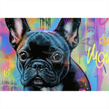 Das Bild zeigt eine französische Bulldogge, die in einem auffälligen und lebendigen Stil dargestellt ist. Die Bulldogge ist zentral im Bild platziert und zeichnet sich durch detaillierte Schattierungen und Texturen aus, die ihren Charakter und Ausdruck einfangen. Der Hintergrund ist eine farbenfrohe Explosion von Graffiti-Elementen, bestehend aus leuchtenden Sprühfarben und symbolischen Formen wie Herzen und Friedenszeichen. Die dominierenden Farben des Hintergrunds sind Blau, Pink und Gelb, die dynamisch miteinander verschmelzen und eine lebhafte Atmosphäre schaffen. Diese Farben kontrastieren mit dem dunklen Fell der Bulldogge, wodurch sie im Vordergrund hervorsticht. Der Künstler hat geschickt Techniken der Street Art eingesetzt, um eine moderne und ansprechende Komposition zu schaffen, die sowohl die Energie als auch die Verspieltheit der urbanen Kunstwelt einfängt. Die kunstvolle Mischung aus realistischer Darstellung der Bulldogge und abstrakten Graffiti-Elementen verleiht dem Bild eine einzigartige Tiefe und Ausdruckskraft. Es spricht Liebhaber von Pop Art und urbaner Kultur gleichermaßen an und bietet eine frische Interpretation eines klassischen Motivs durch die Linse moderner Kunst.
