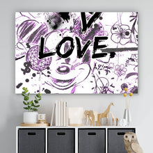 Das Bild zeigt eine dynamisches Bild aus verschiedenen Graffiti-Elementen und Zeichnungen. Im Mittelpunkt stehen zwei große, schwarze Herzen, die den Begriff "LOVE" überlagern. Diese Elemente sind zentral platziert und ziehen sofort die Aufmerksamkeit auf sich. Umgeben sind die Herzen von verschiedenen Zeichnungen und Skizzen, die in lila und schwarzen Tönen gehalten sind. Links sieht man eine Darstellung von Spongebob, während rechts ein Teil von Mickey Mouse zu erkennen ist. Überall auf dem Bild finden sich verschiedene Symbole und Schriftzüge, darunter Dollarzeichen und abstrakte Muster. Oben rechts ist eine Figur mit Flügeln zu sehen, die den Eindruck von Freiheit und Kreativität vermittelt. Der Hintergrund ist überwiegend weiß, wodurch die schwarzen und lila Elemente besonders stark hervortreten. Das Gesamtbild vermittelt eine moderne, urbane Atmosphäre, die an Street Art und Pop-Art erinnert. Es kombiniert bekannte Cartoon-Charaktere mit abstrakten Symbolen und Schriftzügen, was einen interessanten Kontrast zwischen Popkultur und künstlerischem Ausdruck schafft.