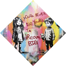 Das Bild zeigt zwei Kinder, ein Mädchen und einen Jungen, die in einem urbanen, künstlerischen Umfeld stehen. Beide Kinder halten bunte Ballons in der Hand, die sich lebhaft vom Hintergrund abheben. Der Hintergrund ist mit farbenfrohem Graffiti bedeckt, das in kräftigen Blau-, Rot-, Gelb- und Pastelltönen gehalten ist. Die Botschaft "You're never too young to dream big" ist in verspielten, roten Buchstaben über die Fläche geschrieben und vermittelt ein Gefühl von Hoffnung und Unbeschwertheit. Das Mädchen trägt ein Kleid mit einem Peace-Zeichen und eine coole Lederjacke, während der Junge einen Pullover mit einem Herzsymbol und eine kleine Teddybär-Figur bei sich hat. Die Szene spiegelt eine Mischung aus kindlicher Unschuld und urbaner Kunst wider, die zum Träumen und Nachdenken anregt. Das Bild strahlt eine positive Energie aus und inspiriert dazu, seine Träume zu verfolgen, unabhängig vom Alter. Die Kombination aus Street Art und der Darstellung von Kindern verleiht dem Bild eine dynamische und gleichzeitig emotionale Tiefe.