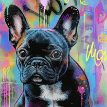 Das Bild zeigt eine französische Bulldogge, die in einem auffälligen und lebendigen Stil dargestellt ist. Die Bulldogge ist zentral im Bild platziert und zeichnet sich durch detaillierte Schattierungen und Texturen aus, die ihren Charakter und Ausdruck einfangen. Der Hintergrund ist eine farbenfrohe Explosion von Graffiti-Elementen, bestehend aus leuchtenden Sprühfarben und symbolischen Formen wie Herzen und Friedenszeichen. Die dominierenden Farben des Hintergrunds sind Blau, Pink und Gelb, die dynamisch miteinander verschmelzen und eine lebhafte Atmosphäre schaffen. Diese Farben kontrastieren mit dem dunklen Fell der Bulldogge, wodurch sie im Vordergrund hervorsticht. Der Künstler hat geschickt Techniken der Street Art eingesetzt, um eine moderne und ansprechende Komposition zu schaffen, die sowohl die Energie als auch die Verspieltheit der urbanen Kunstwelt einfängt. Die kunstvolle Mischung aus realistischer Darstellung der Bulldogge und abstrakten Graffiti-Elementen verleiht dem Bild eine einzigartige Tiefe und Ausdruckskraft. Es spricht Liebhaber von Pop Art und urbaner Kultur gleichermaßen an und bietet eine frische Interpretation eines klassischen Motivs durch die Linse moderner Kunst.