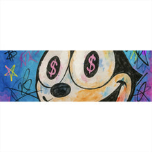 Das Bild zeigt eine fröhliche Cartoon-Katze mit großen, ausdrucksstarken Augen, in denen rosa Dollarzeichen zu sehen sind. Die Katze hat ein breites Lächeln und eine herausgestreckte Zunge, was dem Bild einen humorvollen und verspielten Charakter verleiht. Der Hintergrund ist in kräftigen Blautönen gehalten, die durch gelbe und pinke Akzente ergänzt werden. Über den gesamten Hintergrund sind Graffiti-Elemente verteilt, darunter verschiedene Sterne, Dollar- und Yen-Zeichen sowie bunte Kritzeleien. Am oberen Rand und am unteren Rand des Bildes sind asiatische Schriftzeichen zu sehen, die dem Bild eine zusätzliche kulturelle Dimension verleihen. Die Kombination aus Pop-Art-Elementen und Street-Art-Stil verleiht dem Bild einen modernen und dynamischen Look. Die lebendigen Farben und das verspielte Design ziehen den Betrachter in ihren Bann und vermitteln ein Gefühl von Kreativität und Optimismus.