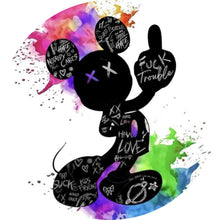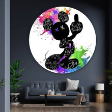 Das Bild zeigt eine schwarze Silhouette, die stilistisch an eine bekannte Maus-Figur erinnert, aber mit einem rebellischen Twist. Die Silhouette ist mit verschiedenen Graffiti-Schriftzügen und Symbolen bedeckt, darunter Wörter wie "LOVE", "HATE", und andere Ausdrücke, die eine gewisse Provokation und Anti-Haltung suggerieren. Diese Schriftzüge sind in Weiß auf dem schwarzen Umriss der Figur geschrieben und verleihen dem Bild eine moderne, urbane Atmosphäre. Im Hintergrund der Figur sind lebendige Farbspritzer in Pink, Blau und Grün zu sehen, die dem Bild einen kraftvollen und dynamischen Effekt verleihen. Diese bunten Spritzer kontrastieren scharf mit der schwarzen Silhouette und schaffen einen auffälligen visuellen Effekt. Die Farbexplosion scheint von der Figur auszugehen, was den Ausdruck von Kreativität und künstlerischer Freiheit verstärkt. Die Kombination aus der bekannten Silhouette, den rebellischen Schriftzügen und den leuchtenden Farben verleiht dem Bild eine starke popkulturelle Ästhetik. Es spricht Themen wie Individualität, Rebellion und künstlerischen Ausdruck an und könnte in einem urbanen oder modernen Kunstkontext platziert sein. Die Farbpalette und das Design machen es zu einem auffälligen Kunstwerk, das sowohl ansprechend als auch provokativ ist.
