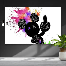 Das Bild zeigt eine schwarze Silhouette, die stilistisch an eine bekannte Maus-Figur erinnert, aber mit einem rebellischen Twist. Die Silhouette ist mit verschiedenen Graffiti-Schriftzügen und Symbolen bedeckt, darunter Wörter wie "LOVE", "HATE", und andere Ausdrücke, die eine gewisse Provokation und Anti-Haltung suggerieren. Diese Schriftzüge sind in Weiß auf dem schwarzen Umriss der Figur geschrieben und verleihen dem Bild eine moderne, urbane Atmosphäre. Im Hintergrund der Figur sind lebendige Farbspritzer in Pink, Blau und Grün zu sehen, die dem Bild einen kraftvollen und dynamischen Effekt verleihen. Diese bunten Spritzer kontrastieren scharf mit der schwarzen Silhouette und schaffen einen auffälligen visuellen Effekt. Die Farbexplosion scheint von der Figur auszugehen, was den Ausdruck von Kreativität und künstlerischer Freiheit verstärkt. Die Kombination aus der bekannten Silhouette, den rebellischen Schriftzügen und den leuchtenden Farben verleiht dem Bild eine starke popkulturelle Ästhetik. Es spricht Themen wie Individualität, Rebellion und künstlerischen Ausdruck an und könnte in einem urbanen oder modernen Kunstkontext platziert sein. Die Farbpalette und das Design machen es zu einem auffälligen Kunstwerk, das sowohl ansprechend als auch provokativ ist.