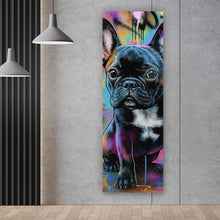 Das Bild zeigt eine französische Bulldogge, die in einem auffälligen und lebendigen Stil dargestellt ist. Die Bulldogge ist zentral im Bild platziert und zeichnet sich durch detaillierte Schattierungen und Texturen aus, die ihren Charakter und Ausdruck einfangen. Der Hintergrund ist eine farbenfrohe Explosion von Graffiti-Elementen, bestehend aus leuchtenden Sprühfarben und symbolischen Formen wie Herzen und Friedenszeichen. Die dominierenden Farben des Hintergrunds sind Blau, Pink und Gelb, die dynamisch miteinander verschmelzen und eine lebhafte Atmosphäre schaffen. Diese Farben kontrastieren mit dem dunklen Fell der Bulldogge, wodurch sie im Vordergrund hervorsticht. Der Künstler hat geschickt Techniken der Street Art eingesetzt, um eine moderne und ansprechende Komposition zu schaffen, die sowohl die Energie als auch die Verspieltheit der urbanen Kunstwelt einfängt. Die kunstvolle Mischung aus realistischer Darstellung der Bulldogge und abstrakten Graffiti-Elementen verleiht dem Bild eine einzigartige Tiefe und Ausdruckskraft. Es spricht Liebhaber von Pop Art und urbaner Kultur gleichermaßen an und bietet eine frische Interpretation eines klassischen Motivs durch die Linse moderner Kunst.