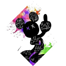 Das Bild zeigt eine schwarze Silhouette, die stilistisch an eine bekannte Maus-Figur erinnert, aber mit einem rebellischen Twist. Die Silhouette ist mit verschiedenen Graffiti-Schriftzügen und Symbolen bedeckt, darunter Wörter wie "LOVE", "HATE", und andere Ausdrücke, die eine gewisse Provokation und Anti-Haltung suggerieren. Diese Schriftzüge sind in Weiß auf dem schwarzen Umriss der Figur geschrieben und verleihen dem Bild eine moderne, urbane Atmosphäre. Im Hintergrund der Figur sind lebendige Farbspritzer in Pink, Blau und Grün zu sehen, die dem Bild einen kraftvollen und dynamischen Effekt verleihen. Diese bunten Spritzer kontrastieren scharf mit der schwarzen Silhouette und schaffen einen auffälligen visuellen Effekt. Die Farbexplosion scheint von der Figur auszugehen, was den Ausdruck von Kreativität und künstlerischer Freiheit verstärkt. Die Kombination aus der bekannten Silhouette, den rebellischen Schriftzügen und den leuchtenden Farben verleiht dem Bild eine starke popkulturelle Ästhetik. Es spricht Themen wie Individualität, Rebellion und künstlerischen Ausdruck an und könnte in einem urbanen oder modernen Kunstkontext platziert sein. Die Farbpalette und das Design machen es zu einem auffälligen Kunstwerk, das sowohl ansprechend als auch provokativ ist.
