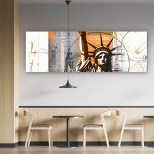 Das Bild zeigt die Freiheitsstatue in einem künstlerischen, abstrakten Stil, der moderne und klassische Elemente kombiniert. Im Vordergrund steht die ikonische Statue, die für Freiheit und Demokratie steht. Sie ist detailliert dargestellt, mit klaren Linien und Schattierungen, die ihre berühmte Silhouette betonen. Die Fackel und die Krone der Statue sind deutlich zu erkennen. Im Hintergrund ist eine stilisierte Skyline von New York zu sehen, die teilweise in Grautönen gehalten ist. Die Gebäude sind schematisch und skizzenhaft angedeutet, was dem Bild einen modernen, urbanen Charakter verleiht. Besonders auffällig ist der orangefarbene Streifen, der vertikal durch das Bild verläuft und ihm eine lebendige Dynamik verleiht. Die Kombination aus architektonischen Elementen, geometrischen Formen und technischen Zeichnungen schafft eine interessante Spannung zwischen Tradition und Moderne. Diese künstlerische Darstellung fängt nicht nur die Essenz der Freiheitsstatue ein, sondern auch den Puls der Stadt New York als ein Symbol für Fortschritt und Entwicklung. Das Bild vermittelt ein Gefühl von Bewegung und Energie, das typisch für das Leben in einer Metropole ist.