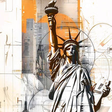 Das Bild zeigt die Freiheitsstatue in einem künstlerischen, abstrakten Stil, der moderne und klassische Elemente kombiniert. Im Vordergrund steht die ikonische Statue, die für Freiheit und Demokratie steht. Sie ist detailliert dargestellt, mit klaren Linien und Schattierungen, die ihre berühmte Silhouette betonen. Die Fackel und die Krone der Statue sind deutlich zu erkennen. Im Hintergrund ist eine stilisierte Skyline von New York zu sehen, die teilweise in Grautönen gehalten ist. Die Gebäude sind schematisch und skizzenhaft angedeutet, was dem Bild einen modernen, urbanen Charakter verleiht. Besonders auffällig ist der orangefarbene Streifen, der vertikal durch das Bild verläuft und ihm eine lebendige Dynamik verleiht. Die Kombination aus architektonischen Elementen, geometrischen Formen und technischen Zeichnungen schafft eine interessante Spannung zwischen Tradition und Moderne. Diese künstlerische Darstellung fängt nicht nur die Essenz der Freiheitsstatue ein, sondern auch den Puls der Stadt New York als ein Symbol für Fortschritt und Entwicklung. Das Bild vermittelt ein Gefühl von Bewegung und Energie, das typisch für das Leben in einer Metropole ist.
