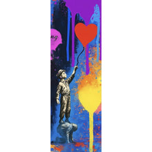 Das Bild zeigt ein lebhaftes und dynamisches Kunstwerk voller Farben und Ausdruck. Im Mittelpunkt steht der Schriftzug "LIFE IS BEAUTIFUL", ergänzt durch das Wort "fucking" in kleinerer Schrift. Diese Botschaft vermittelt eine kraftvolle und positive Lebenseinstellung. Links im Bild ist eine ikonische Comicfigur, mit einem freundlichen Lächeln und einer grünen Tasche. Er sitzt auf einem bunten Hintergrund mit fließenden, tropfenden Farben, die dem Bild eine lebendige und energetische Atmosphäre verleihen. Rechts steht eine realistische Figur eines Jungen, der auf einem Podest steht und nach einem roten Ballon in Herzform greift. Diese Szene ist ebenfalls von einem bunten, tropfenden Hintergrund umgeben, der in kräftigen Blau-, Gelb- und Orangetönen gehalten ist. Die Kombination von Comic- und realistischen Elementen sowie die Verwendung von kräftigen Farben und fließenden Formen verleihen dem Bild eine moderne Street-Art-Ästhetik. Es spiegelt eine Mischung aus Popkultur und urbaner Kunst wider und verkörpert eine Botschaft der Hoffnung und Lebensfreude.