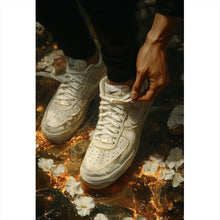 - Motivname: Weiße Sneaker auf glühendem blumenbedecktem Boden