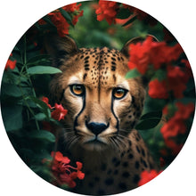 - Motivname: Gepard schaut neugierig durch rote Blumen