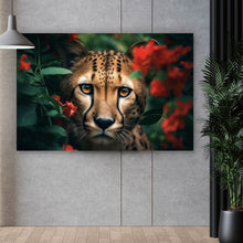 - Motivname: Gepard schaut neugierig durch rote Blumen
