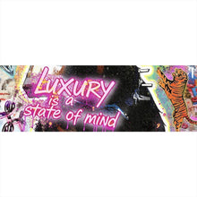 Das Bild zeigt eine lebendiges Pop-Art Bild, die von einem realistischen Hundeporträt dominiert wird. Der Hund hat ein dunkles Fell und schaut direkt in die Kamera, was ihm eine starke Präsenz verleiht. Rund um den Hund sind verschiedene künstlerische Elemente im Graffiti-Stil verteilt. In der oberen linken Ecke steht in lila Schrift "GOOD BOY", während sich in der Mitte der Schriftzug "Luxury is a state of mind" in leuchtendem Pink abhebt. Diese Aussage wird durch die Darstellung von Luxusartikeln wie Diamanten und einer eleganten Uhr verstärkt. Im Hintergrund sind zahlreiche bunte Grafiken zu sehen, darunter ein Cartoon-Charakter, ein Tiger und weitere Symbole, die den urbanen und modernen Stil der Collage unterstreichen. Die Komposition ist dynamisch und farbenfroh, was das Auge des Betrachters anzieht und die verschiedenen Themen und Elemente harmonisch miteinander verbindet. Die Collage vermittelt ein Gefühl von Luxus, Individualität und künstlerischem Ausdruck, eingebettet in eine urbane Ästhetik.